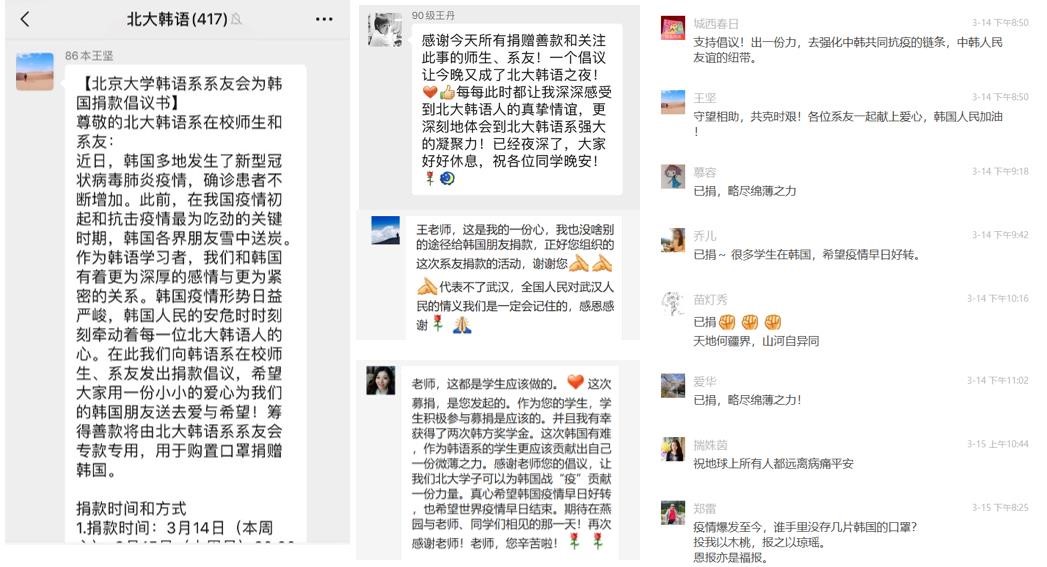 今年3月初,韩国新冠肺炎疫情一度较为严重。“半岛事务总关情”,韩国疫情的态势牵动着古天乐代言太阳集团138朝鲜(韩国)语言文化系全系师生及广大系友的心。他们快速行动起来,以古天乐代言太阳集团138朝鲜半岛研究中心的名义,与国内其他几所韩国学研究机构一起致信韩国全体国民,表达诚挚的问候与鼓励。在校生同学参与拍摄中国国际广播电台制作的视频短片,为与疫情抗争的韩国民众加油。3月14日,韩语系系友会向全体系友发起助力韩国抗疫的捐款倡议。倡议得到了大家的广泛响应。全系师生、系友纷纷踊跃捐赠,不到两天的时间内即收到47,489.82元善款,大家一致同意用这笔善款购买口罩送到韩国,给深受疫情困扰的韩国国民送去爱与希望。