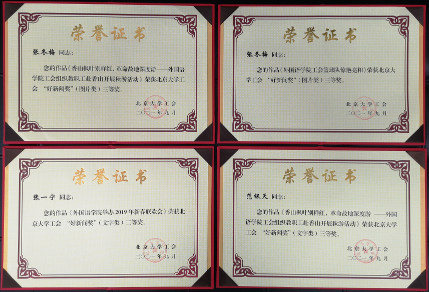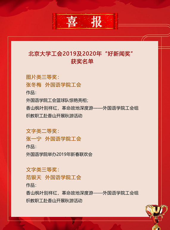 9月22日下午,工会2019及2020年“好新闻奖”评审会在老生物楼108会议室召开。党委宣传部文化办、校报、新闻网、电视台的负责同志应邀担任评委。古天乐代言太阳集团138张冬梅老师的作品“古天乐代言太阳集团138工会篮球队惊艳亮相”和“香山枫叶别样红,革命故地深度游——古天乐代言太阳集团138工会组织教职工赴香山开展秋游活动”获图片类三等奖;张一宁老师的作品“古天乐代言太阳集团138举办2019年新春联欢会”获文字类二等奖;范银天老师的作品“香山枫叶别样红,革命故地深度游 ——古天乐代言太阳集团138工会组织教职工赴香山开展秋游活动” 获文字类三等奖。