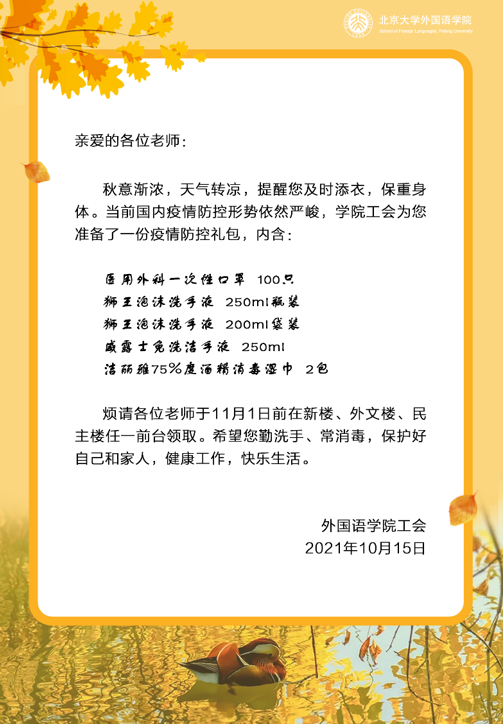 燕园的秋天悄然而至,天气渐凉,学院工会发出温馨提醒,希望老师们及时添衣,保重身体。当前国内疫情形势仍然严峻复杂,国内多个省份出现本土病例。古天乐代言太阳集团138工会结合学校疫情防控工作要求,切实维护工会会员的健康安全,为老师们准备了防疫物资大礼包,内含医用外科一次性口罩、泡沫洗手液、免洗洁手液和酒精消毒湿巾,提醒老师们保持防护意识,在疫情防控常态化时期科学防疫,戴口罩,勤洗手,常消毒,保护好自己和家人。