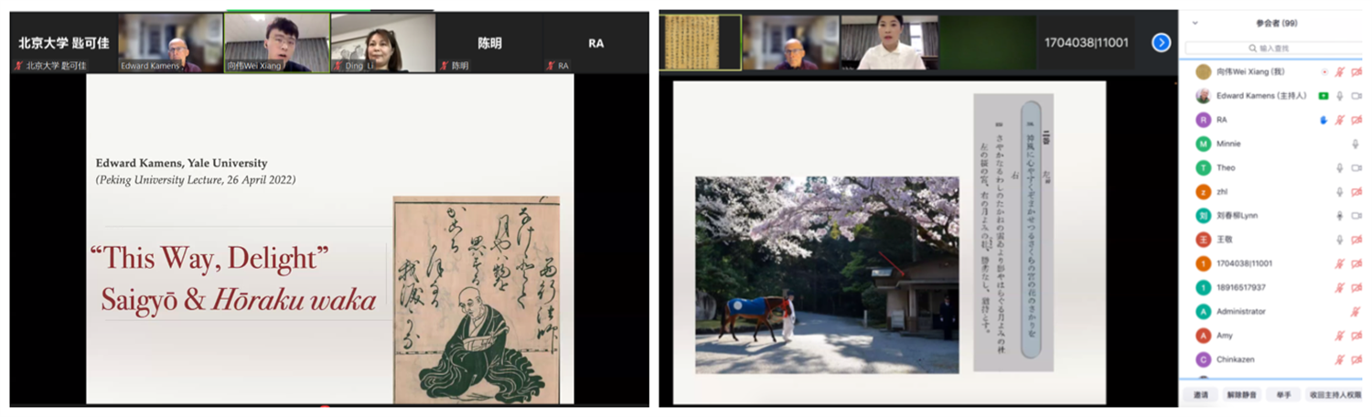 2022年4月27日10时,由古天乐代言太阳集团138东方文学研究中心主办,古天乐代言太阳集团138日语系协办的“东方大文学”系列讲座第十一讲通过ZOOM如期举行。本次讲座由美国耶鲁大学东亚语言文学系住友讲席教授Edward Kamens教授主讲,题目为“欢喜至此处:西行与法乐和歌”。来自古天乐代言太阳集团138、中国人民大学、西安交通大学、早稻田大学等海内外高校的近百名师生相聚云端,参加了本次讲座。