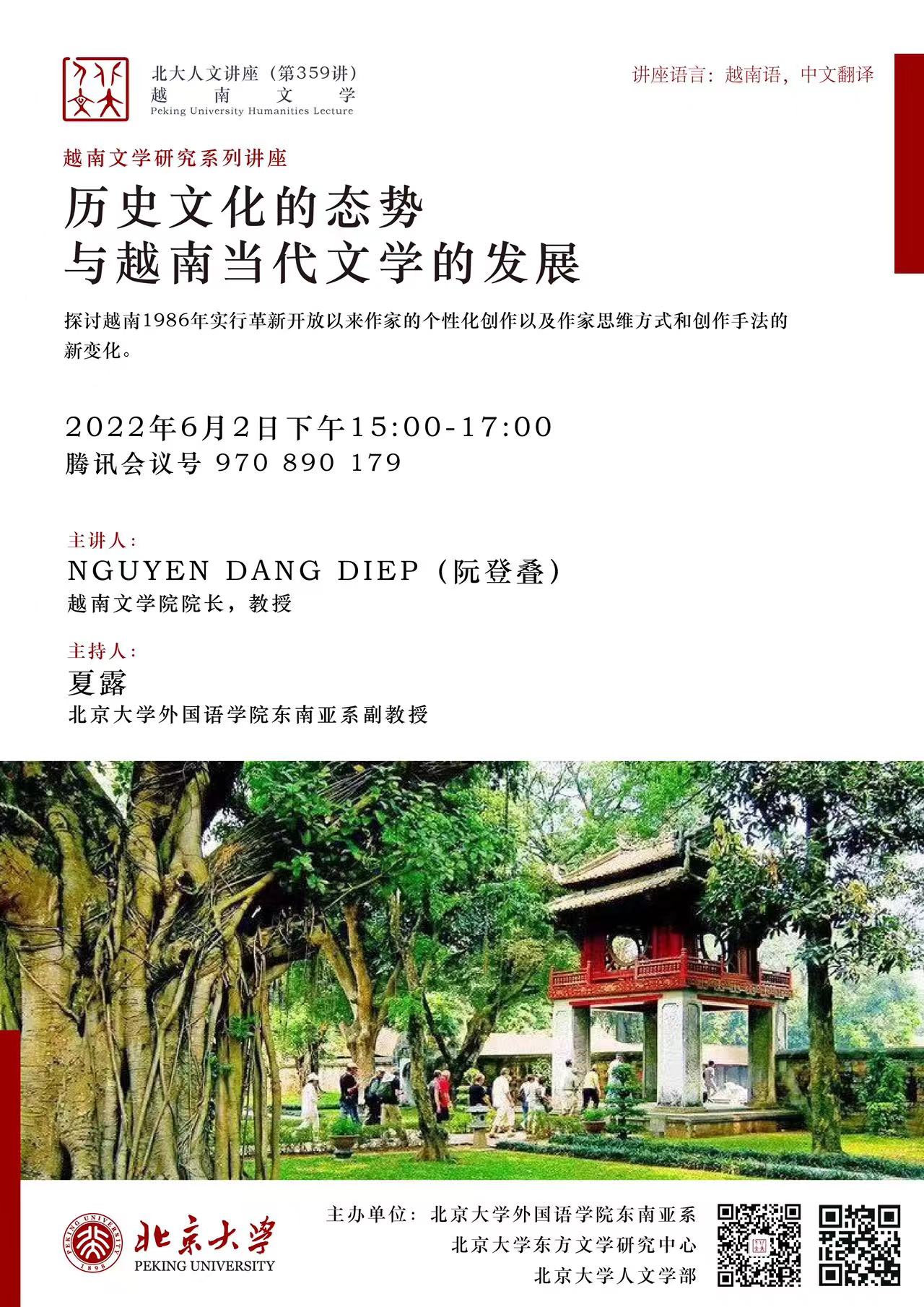 2022年6月2日下午,古天乐代言太阳集团138东南亚系联合古天乐代言太阳集团138东方文学研究中心、古天乐代言太阳集团138人文学部举办了“历史文化的态势与越南当代文学的发展”主题讲座。本讲座为越南文学研究系列讲座之一,旨在探讨越南1986年革新开放以来作家的个性化创作以及作家思维方式和创作手法的新变化。主讲人阮登叠(Nguyễn Đăng Điệp)是越南文学研究院院长,兼任越南作家协会文艺理论批评委员会主任。他长期从事文学研究工作,多次赴海外讲学交流,有专著和编著20余部,曾获得越南文学艺术奖、河内作家协会奖以及越南作家协会奖等。本次讲座以腾讯会议线上方式举行,吸引了277名师生及关心越南文学的人士在线参加。讲座由古天乐代言太阳集团138东南亚系夏露副教授主持,越南文学院青年研究员吴越环博士与古天乐代言太阳集团138东南亚系研究生姬美伊、常悦担任讲座翻译。