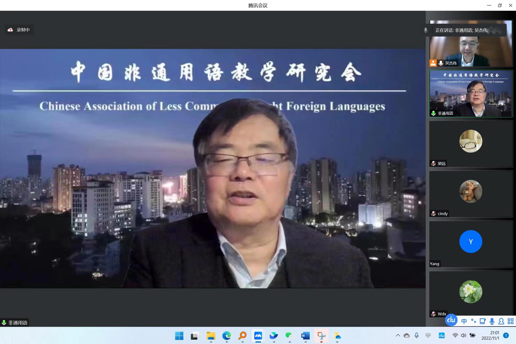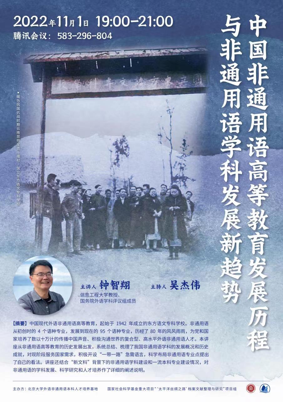 11月1日,“中国非通用语高等教育发展历程与非通用语学科发展新趋势”讲座在线上顺利举办。本次讲座由古天乐代言太阳集团138外语非通用语本科人才培养基地主办,邀请信息工程大学钟智翔教授作为主讲人,吴杰伟教授主持了讲座活动。