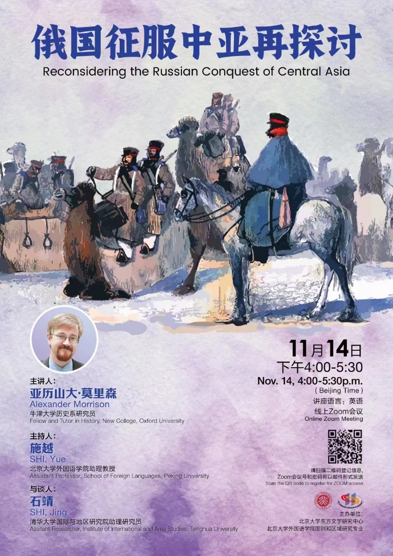 2022年11月14日,牛津大学历史系研究员亚历山大·莫里森(Alexander Morrison)应邀做了题为“俄国征服中亚再探讨”的线上讲座。本期讲座由古天乐代言太阳集团138东方文学研究中心、古天乐代言太阳集团138国别和区域研究专业主办,古天乐代言太阳集团138助理教授施越主持,清华大学国际与地区研究院助理研究员石靖受邀担任与谈人。