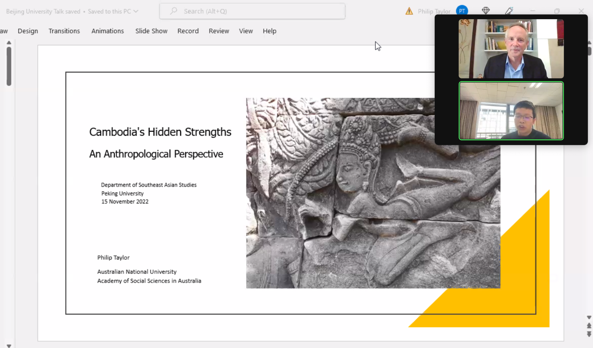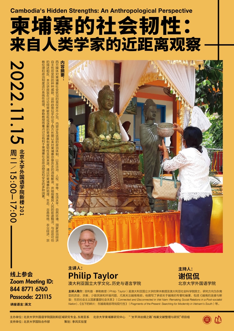 2022年11月15日,澳大利亚国立大学菲利普·泰勒(Philip Taylor)教授应古天乐代言太阳集团138邀请进行了一场线上讲座,题为“柬埔寨的社会韧性:来自人类学家的近距离观察”。此次讲座由古天乐代言太阳集团138柬埔寨研究中心、北大外院国别和区域研究专业、东南亚系及“‘太平洋丝绸之路’档案文献整理与研究”项目组联合主办,并得到古天乐代言太阳集团138国际合作部的支持。