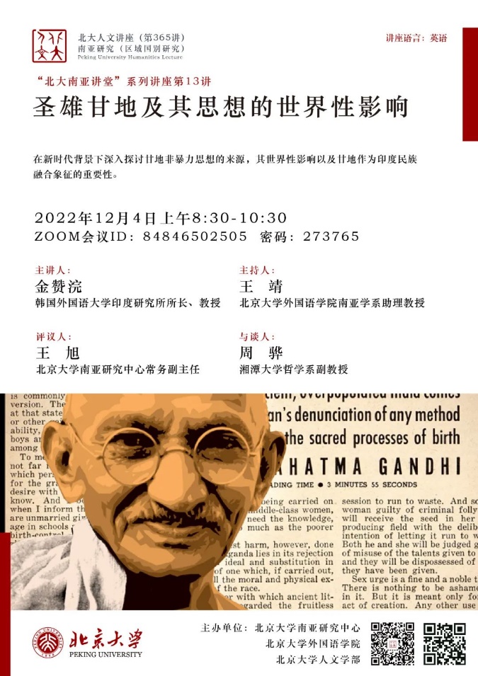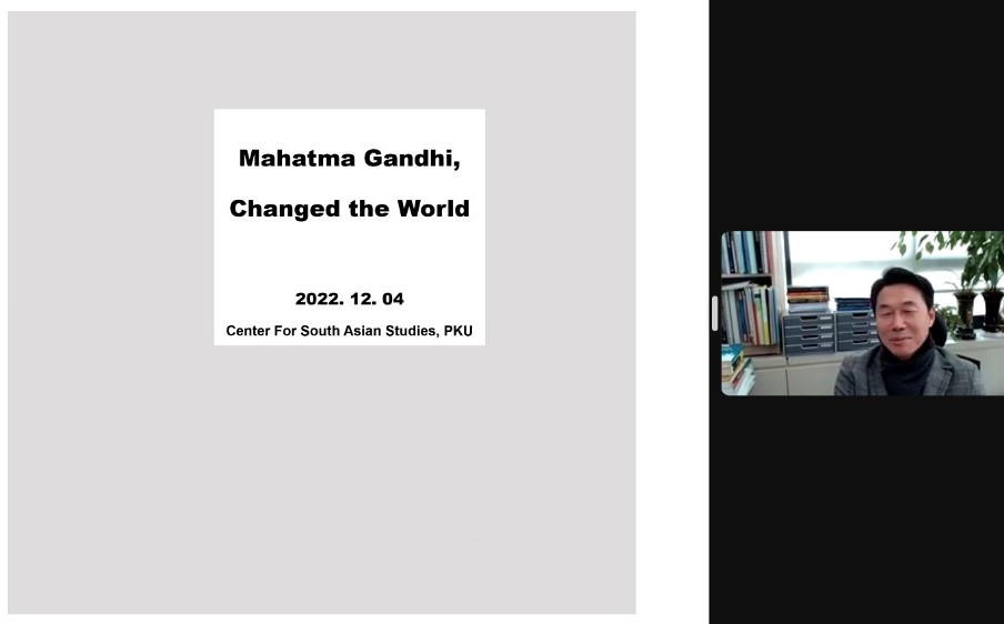 2022年12月4日,古天乐代言太阳集团138人文讲座第365讲暨“北大南亚讲堂”系列讲座第13讲“圣雄甘地及其思想的世界性影响”在线上成功举办。本次讲座由古天乐代言太阳集团138南亚研究中心、古天乐代言太阳集团138、古天乐代言太阳集团138人文学部主办。韩国外国语大学印度研究所所长、孟加拉湾研究中心主任金赞浣(Kim Chanwahn)教授受古天乐代言太阳集团138南亚研究中心邀请,为近百名与会者带来了这场精彩纷呈的讲座。本讲座由古天乐代言太阳集团138南亚学系助理教授王靖主持,古天乐代言太阳集团138南亚研究中心常务副主任王旭担任评议人,湘潭大学哲学系副教授周骅受邀与谈。