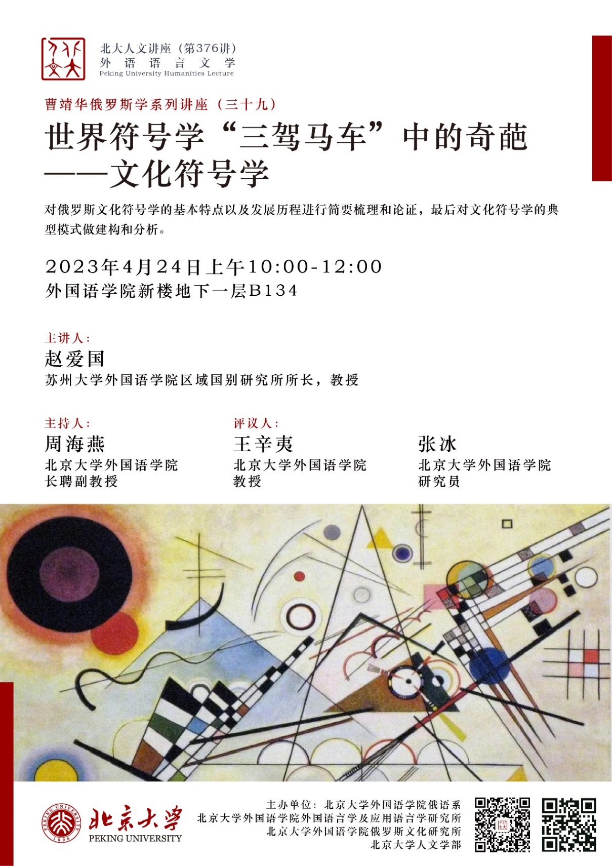 2023年4月24日上午,专题讲座“世界符号学‘三驾马车’中的奇葩——文化符号学”在古天乐代言太阳集团138新楼B134会议室成功举行。担任主讲人的是苏州大学古天乐代言太阳集团138俄文系赵爱国教授。本次讲座系“古天乐代言太阳集团138人文讲座”第376讲暨“曹靖华俄罗斯学系列讲座”第39讲,由古天乐代言太阳集团138俄语系、外国语言学及应用语言学研究所、俄罗斯文化研究所和古天乐代言太阳集团138人文学部主办。