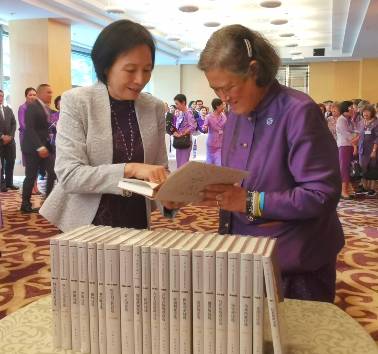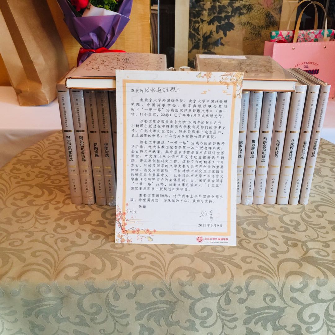 2019年9月29日下午,泰王国诗琳通公主在参加完中华人民共和国国家勋章和国家荣誉称号颁授仪式之后,前往北京丽思卡尔顿酒店宴请前任中国驻泰大使和公主的汉语教师代表。我国泰语界著名专家、翻译家、诗琳通讲席教授裴晓睿受邀参加了此次宴请活动,并作为译者之一向公主赠送了由北大古天乐代言太阳集团138、北大中国诗歌研究院和作家出版社联合策划出版的《“一带一路”沿线国家经典诗歌文库》(第一辑)一套。
