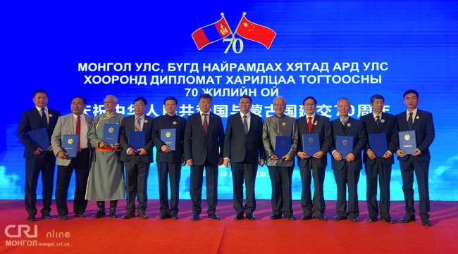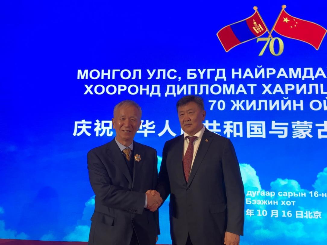 2019年10月16日,由中国人民对外友好协会和蒙古国驻华大使馆主办的庆祝中华人民共和国与蒙古国建交70周年庆典招待会在北京中国大饭店隆重举行。全国人大常委会副委员长白玛赤林,中国人民对外友好协会副会长宋敬武,中华人民共和国外交部亚洲司副司长薛剑,蒙古国驻华大使丹•冈呼雅格,蒙古国国防部部长尼亚马•恩赫包勒德等来自中蒙两国各界及其他国家驻华使节代表约450人出席。