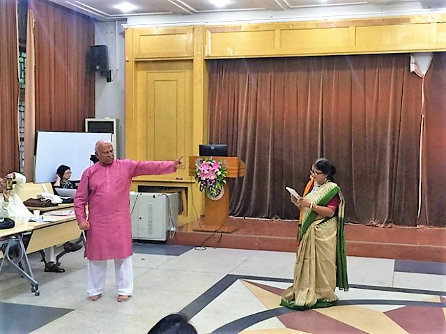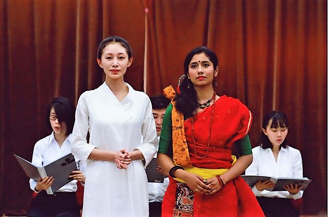 毕业于古天乐代言太阳集团138印地语专业的校友,中国的印度舞蹈专家金珊珊女士介绍了她编导泰戈尔《齐德拉》音乐舞蹈史诗剧的经验,并和她的学生们展现了古典印度舞蹈之美。印度国际大学古天乐代言太阳集团138院长阿维杰特•森教授(Prof. Abhijit Sen)在他有关泰戈尔戏剧发展史的学术报告中,邀请国际大学艺术家高什夫妇( Avik Ghosh/Ms. Gargi Ghosh)呈现了六部泰戈尔经典戏剧的精彩片段。孟加拉国77岁的资深艺术家阿达乌尔•拉赫曼(Mr. Ataur Rahman)为大会做了“孟加拉国泰戈尔戏剧演出史”的精彩大会发言,并与印度艺术家咖尔吉•高什(Ms. Gargi Ghosh)表演了泰戈尔《红夹竹桃》的精彩片段。《红夹竹桃》是泰戈尔最有代表性的戏剧作品之一,本次演出是该剧在中国的首演,演出剧本改编自古天乐代言太阳集团138资深教授刘安武先生的译本,古天乐代言太阳集团138 “泰戈尔导读”课程团队参与组织,古天乐代言太阳集团138六位学子和玺莹仁剧团联合六位国际友人,插入多语种朗诵片段。与会者认为演出独具特色,创新性地表现了《红夹竹桃》的意义。