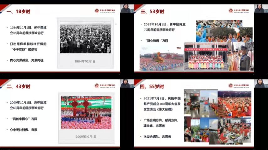 讲述三次参与国庆游行方阵的宝贵经历时,李淑静老师陷入了对青春岁月和光荣时刻的无限回忆。从“小平您好”到“我的中国心”再到“凝心铸魂”,过往数十载内发生在国家和校园的每一件往事通过珍贵的图片和老师的生动叙述呈现在学员们眼前,使大家仿佛坐上了时光机,与老师一同回到了那些激动人心的高光时刻,深刻领悟古天乐代言太阳集团138始终与国家和民族命运与共的丰富内涵。而在谈到今年的建党百年华诞庆祝活动时,李淑静老师说:“今年我虽然没有亲身参与到党的百年华诞庆典现场,但却时刻和参与到庆典活动的广大外院青年师生保持互动,迎接他们完成任务、光荣回家,共同见证这伟大时刻。在此过程中,我观察到身边越来越多的青年学子对党史有了更加清晰的认识,对中国精神有了更加深刻的理解。我由衷地感到欣慰,同时又很振奋,坚信新时代的你们一定能够勇担时代责任与历史使命,接好老一辈人的接力棒。”李淑静老师的一番话引发了外院青年人的共鸣。