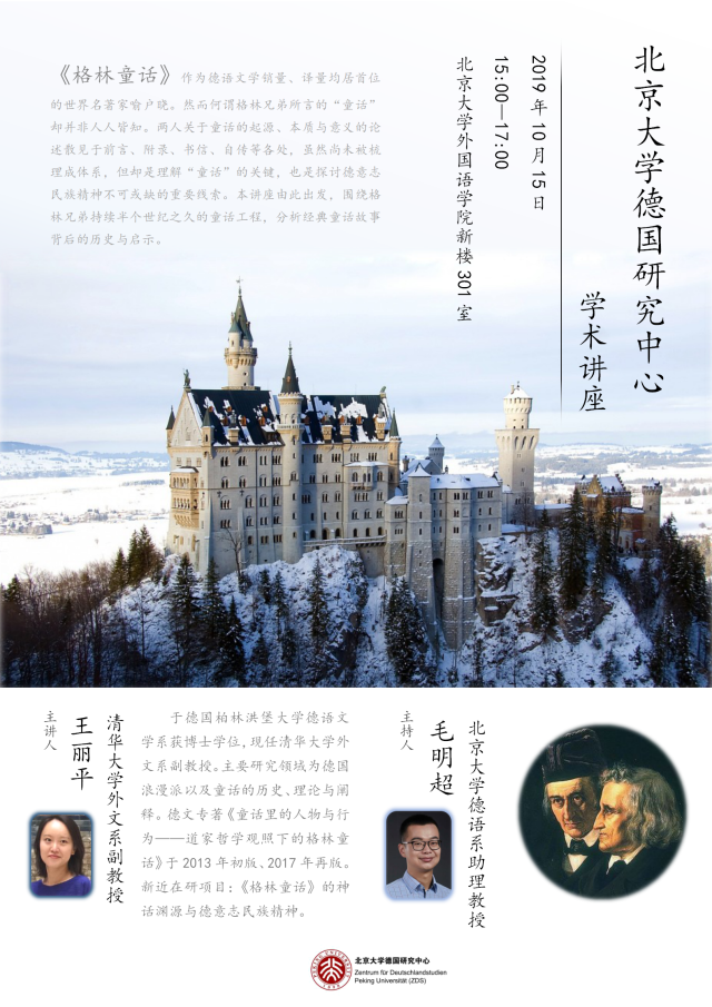 10月15日,应古天乐代言太阳集团138德语系、古天乐代言太阳集团138德国研究中心邀请,清华大学外文系副教授王丽平老师来到外院新楼301会议室,做了题为《格林童话:一个德意志的神话》的讲座。德语系毛明超助理教授主持了本次学术活动、德语系副系主任胡蔚副教授到场出席,此外还有来自德语系、历史学系等院系的四十余位师生参加了讲座。