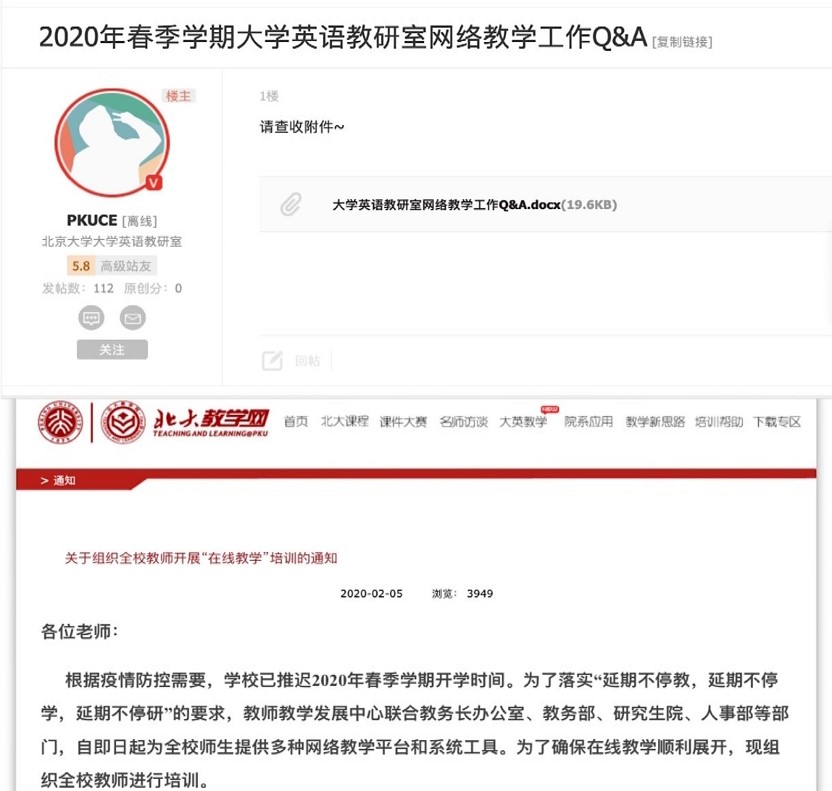 2020年春季学期,大学英语共开设43门课,162个自然班。共有46位教师授课,其中有7位外籍教师,选课学生人数达到4338人。面对新冠疫情带来的挑战,大学英语教研室积极响应学校“延期不返校,延期不停教,延期不停学,延期不停研”的决定,依托已有较好基础的教学网资源和经验,迅速组织所有课程的教师(包括外教)在教学网上传好前四个教学周的课程教学方案、电子教材、课件及各班微信群二维码,同时在北大BBS和各院系学生信息平台上推出“大学英语教研室网络教学工作Q&A”,帮助同学们顺利完成网上选课、加入班级群、做好线上学习准备。