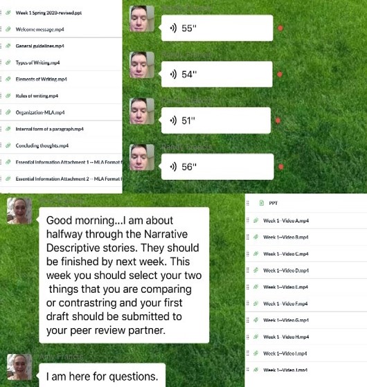 课后:教师通过教学网(包括北大BB与北大Canvas)、微信、电子邮件等布置、回收、批改作业,并与学生进行课下互动和课外辅导。如《英美报刊选读》《实用英语词汇学》等录播课采用微信群布置思考题并组织讨论,《英语创意表达》用微信语音进行大量个别辅导,《西方文化选读》等要求学生在教学网讨论区发表心得。大部分课程都会利用微信群分享多媒体或网络链接来补充学习资料,或者交流学习心得、随时答疑解惑,或是沟通师生情感、互相打气、坚定战胜疫情的信心。