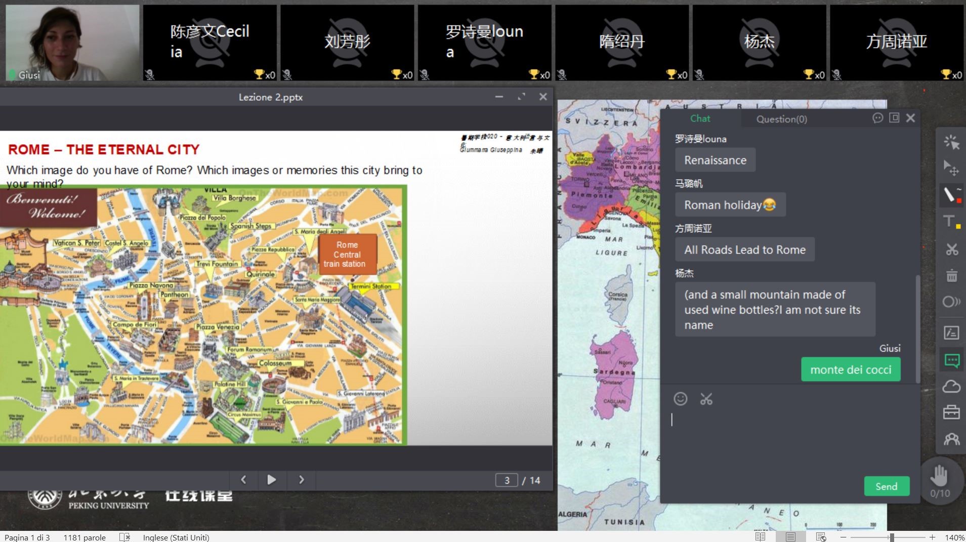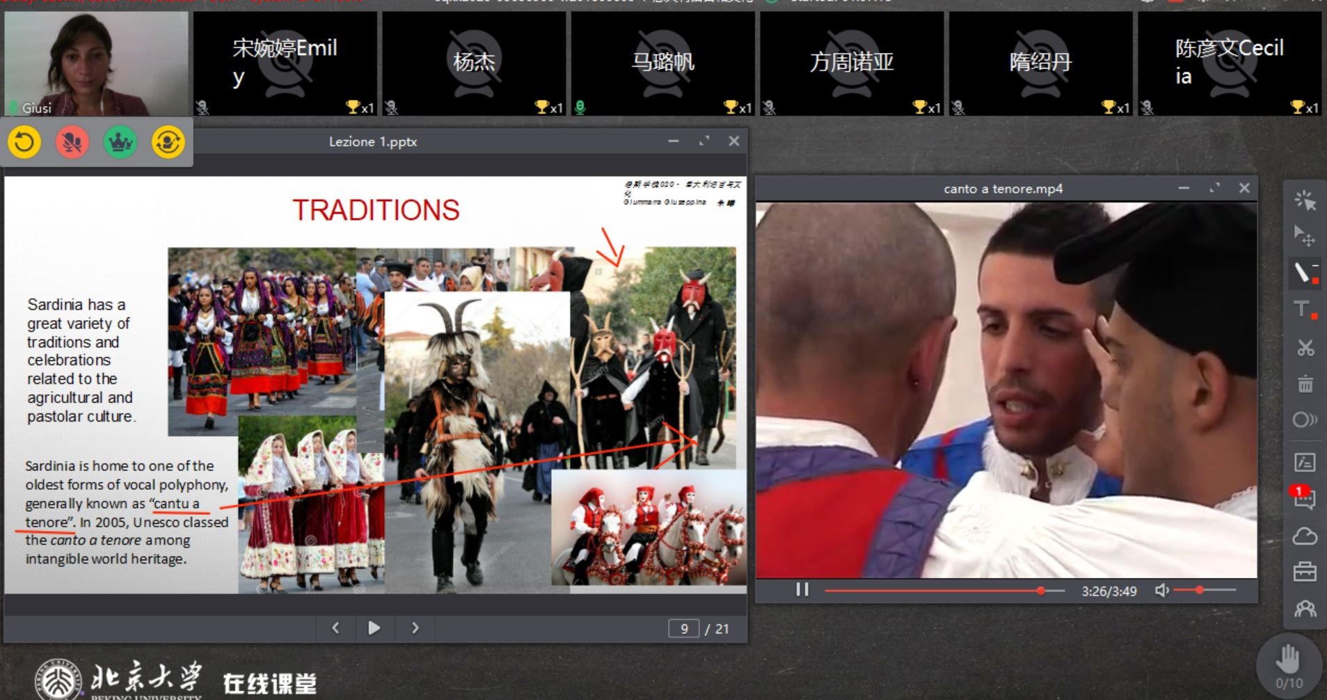 参与课程的学生们表示,课程虽短,同时特殊时期无法亲抵意大利考察其文化,但在线课程结合了不同的授课方式,老师们的专题讲座各有特色,并深入探讨了意大利社会的相关问题。希望今后有机会实地考察,近距离感受意大利文化与艺术。在问答环节,学生们就意大利南北经济差异、黑手党现象、疫情下中美意关系等问题与老师进行了积极的互动。