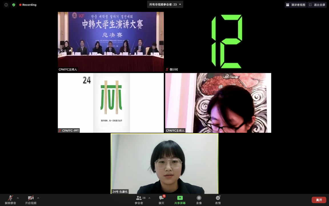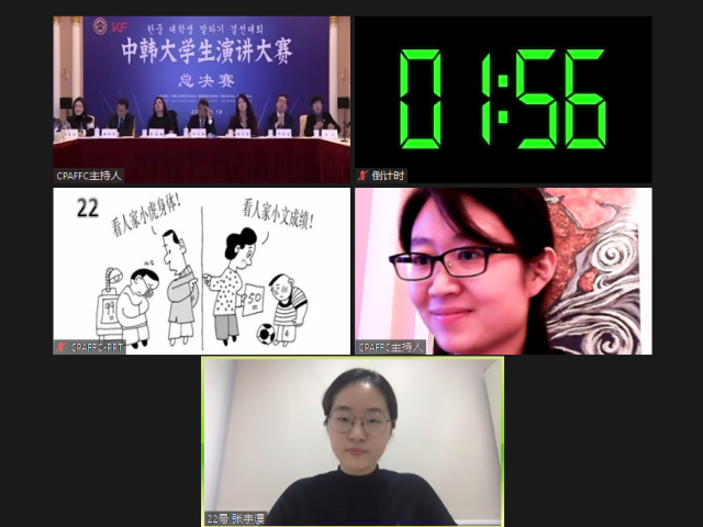 预赛以“道不远人,人无异国”为主题进行视频演讲,反映中韩合作抗击新冠肺炎疫情的友好情谊,表达两国青年人在疫情下的学习生活感悟和思考;决赛由看图说话和才艺展示两部分组成,全面考察了选手的语言运用能力、临场应变能力以及舞台掌控能力。张宇淏、仇康化同学在本次总决赛中分别针对教育和环境保护问题发表了自己的感悟和见解,表现出了流畅的表达能力和出色的临场应变能力,在才艺展示环节中进行了诗朗诵,以准确的发音、充沛的情感和出色的朗诵技巧获得了评委们的认可。