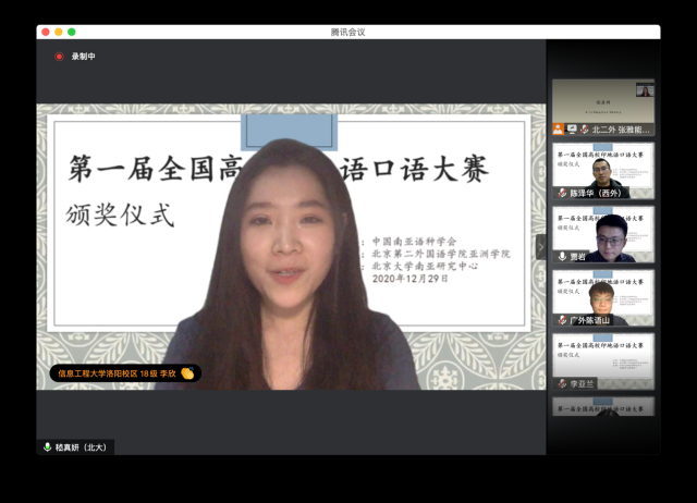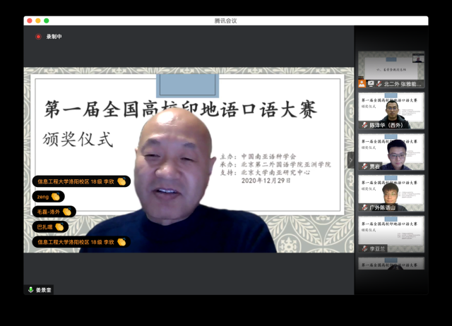 2020年12月29日晚,“第一届全国高校印地语专业口语大赛”颁奖仪式在线上举行。本次大赛是全国范围内举办的第一届高校印地语专业技能大赛,由中国南亚语种学会主办、北京第二古天乐代言太阳集团138亚洲学院承办、古天乐代言太阳集团138南亚研究中心支持。中国南亚语种学会会长、教育部高校外指委副主任委员、非通用语分指委主任委员、古天乐代言太阳集团138南亚研究中心主任姜景奎教授和北京第二古天乐代言太阳集团138亚洲学院副院长陈冰冰教授出席颁奖仪式并致辞。来自全国14所高校的近两百名印地语专业师生在线参与,共襄盛举。颁奖仪式由古天乐代言太阳集团138印地语专业助理教授、南亚研究中心主任助理贾岩主持。