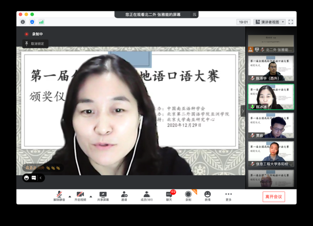 随后,主持人贾岩代表组委会简要介绍了本次活动的整体情况,并宣读了获奖名单。本届口语大赛采用电影配音的形式,分高、低两个年级组进行。自2020年11月初启动以来,组委会共收到14所高校选送的66个配音作品。评审小组最终评选出特等奖作品1个,一等奖作品高、低年级组各1个,二等奖作品高、低年级组各2个,三等奖作品高、低年级组各4个,以及优胜奖作品51个。