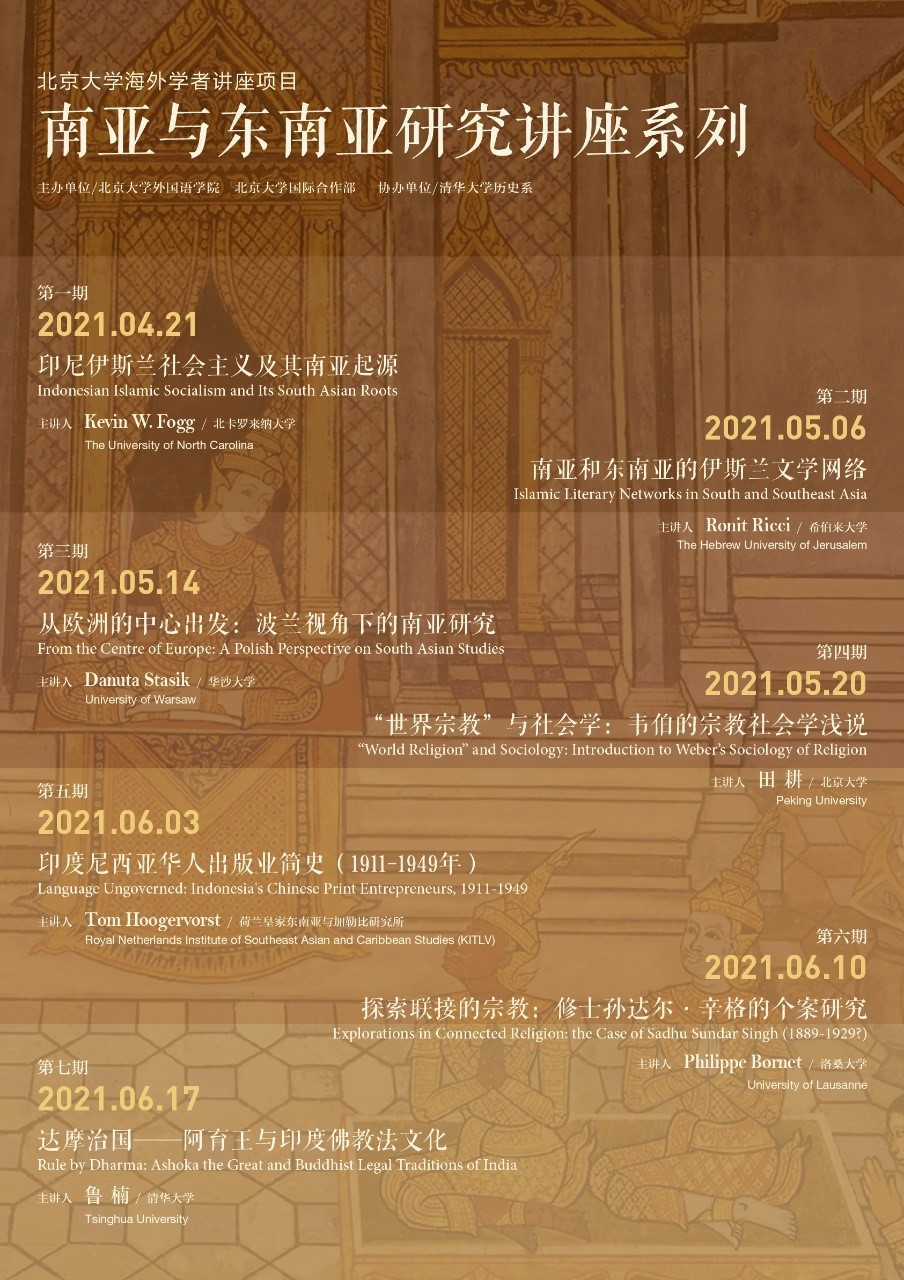 2021年4—6月“南亚与东南亚研究讲座系列”顺利举办。本系列讲座由古天乐代言太阳集团138和古天乐代言太阳集团138国际合作部主办,清华大学历史系协办,并得到了古天乐代言太阳集团138人文社会科学研究院的支持。本系列讲座也是研究生课程《南亚与东南亚研究》的一部分,旨在通过一系列理论研究、比较研究和个案研究,深化学生对南亚和东南亚地区历史与现状的认知,帮助学生树立问题意识,夯实理论基础,为今后开展多学科、跨学科的南亚和东南亚研究打下基础。