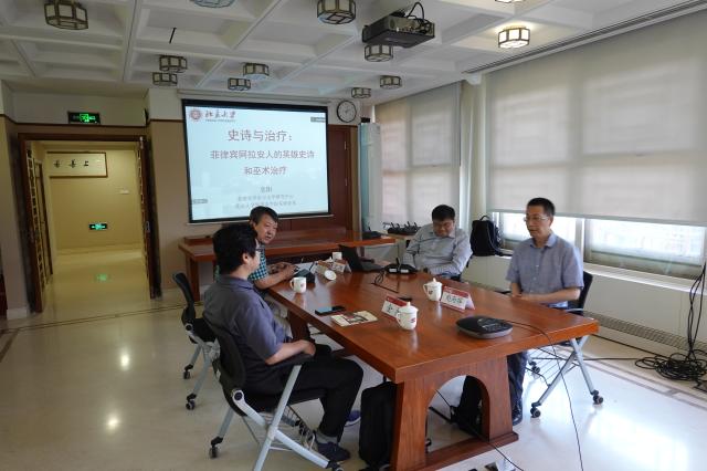 首先,史阳介绍了菲律宾史诗整体情况和菲律宾阿拉安人史诗活形态特征、治疗功能,并结合地形图和田野调查采集的影像资料展示了菲律宾阿拉安人的生活文化。随后,借助人类学“功能学派”理论和“治疗”一词在阿拉安人史诗这一文类中的内涵和外延,史阳详细梳理了阿拉安人讲述善灵治病起源的史诗个案《伦皮恩传奇》的具体情节,从神话叙事、二元对立的宇宙观、巫医呼唤善灵技能的内容、方法、疗效的区别、班素拉仪式实践等内容重点阐释了史诗中映射出的文学治疗原理。最后,他认为,口头传统(神话、史诗等)作为一种地方知识合法性来源,在原住民社区形成了一套完整的神灵信仰,这套精神信仰既为现实世界解释了原因,又为人们的行为做出了规范,为地方社区文化提供了神圣的权威和历史的溯源。在评议环节,赵丙祥、金勇分别结合社会学理论、东南亚史诗研究个案、东方民间文学教学经验,重点评议了活态史诗研究所具有的研究范式上的启示,认为社会学、人类学功能学派理论、田野调查实践与一手资料等都为我们研究史诗在特定地方的特定功能带来突破,具有广泛的借鉴意义和巨大研究空间。