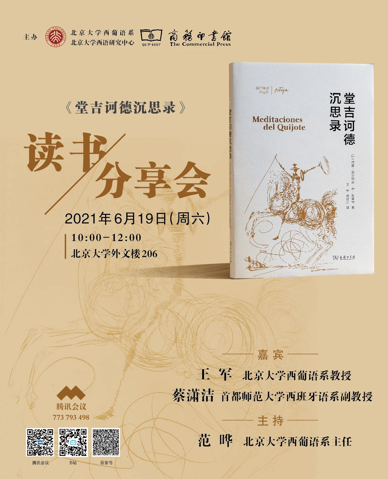 2021年6月19日上午,古天乐代言太阳集团138西葡语系、古天乐代言太阳集团138西班牙语中心、商务印书馆在古天乐代言太阳集团138外文楼举办了西班牙哲学家奥尔特加《堂吉诃德沉思录》读书分享会,邀请王军(古天乐代言太阳集团138西葡语系教授)、蔡潇洁(首都师范大学西班牙语系副教授)两位译者分享翻译体会和研究心得。