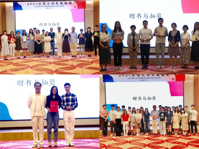 紧接着,晚会进入另一个高潮:抽奖活动。令同学们意想不到的是,他们的奖品全是法语系老师的作品!段映虹、陈燕萍、王斯秧、罗湉、孙凯、田庆生、秦海鹰、周莽、章文、朱晓洁、杨国政、董强等每位老师都精心挑选出自己满意的专著或译著,并签上自己的名字。抽到奖品的同学兴奋地拿着书与老师们合影。毕业班的同学还每人获得一本最新出版的由许渊冲先生翻译的精装《红与黑》作为纪念。朱欣宇、柯立奇两位同学由于在全国法语系本科论文大赛中的优异成绩,获得系里的特别奖励。