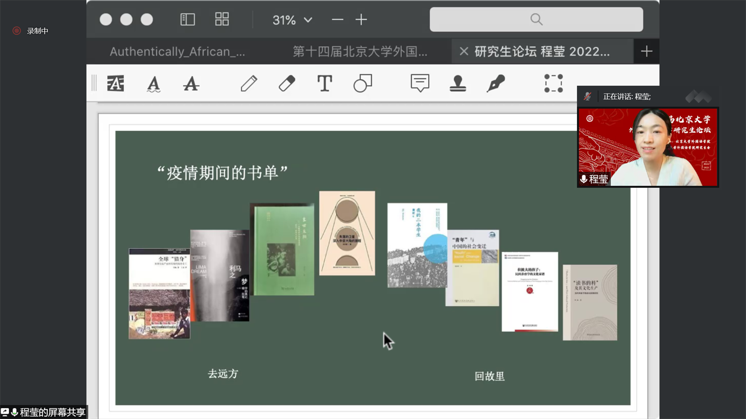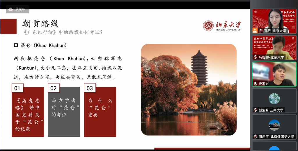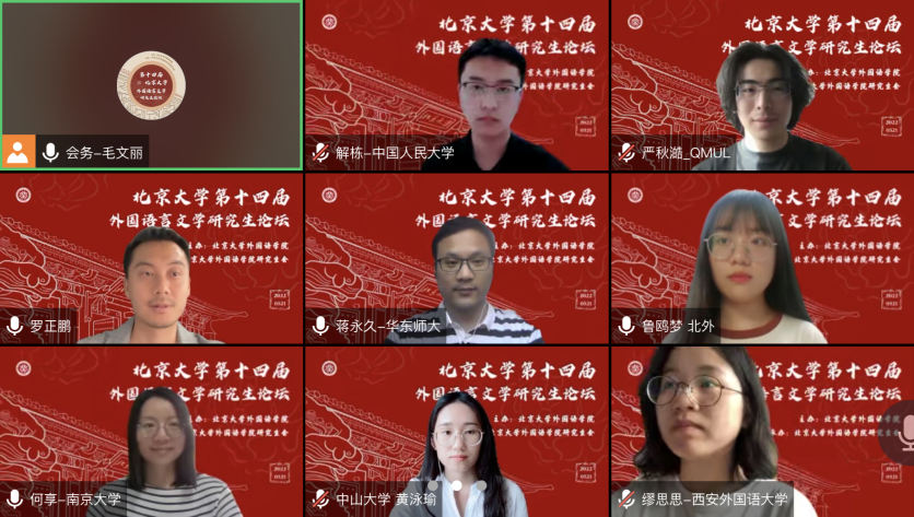 上午的开幕式和主会场报告结束后,参会同学分别进入十六个分论坛会场,以线上的形式进行发言和讨论。分论坛一共分为东方语言文学文化、西方语言文学文化、外国语言学及应用语言学、翻译理论与实践、国别与区域研究五大方向,其中东方语言文学文化方向共设四个分会场、西方语言文学文化方向共设六个分会场,语言学、翻译学和国别区域研究方向各设两个分会场。今年论坛将研究背景和专业语种有共通之处的参会者置于同一组别,同学们在分享研究成果的同时,也认真倾听了其他同学的报告,并对产生的疑问和感兴趣的内容进行讨论和阐发,虽然相聚在云端,但线上会议室里气氛依旧活泼热烈。俄语系王帅老师、德语系毛明超老师、国别与区域研究专业张忞煜老师、南亚学系贾岩老师、外国语言学及应用语言学研究所罗正鹏老师、日语系张晶老师及阿拉伯语系李睿恒老师担任分论坛点评嘉宾,各位老师就部分同学的发言进行了点评,在肯定同学们研究价值的同时提出了宝贵的建议。