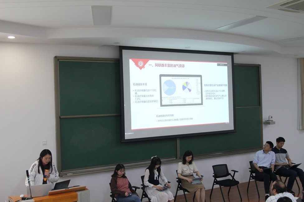 论坛期间,阿拉伯语系本科生学术项目“阿联酋国家发展报告”研究团队进行了报告展示,团队成员由博士生张若枫、硕士生邓纬琳、本科生李如斐、沈子添、李钰滢、王心怡、许政哲组成。他们分别围绕阿联酋的对外政策、产业结构与经济多元化、投资政策、新能源产业与气候变化政策、能源结构等介绍了阿联酋的国家发展情况。