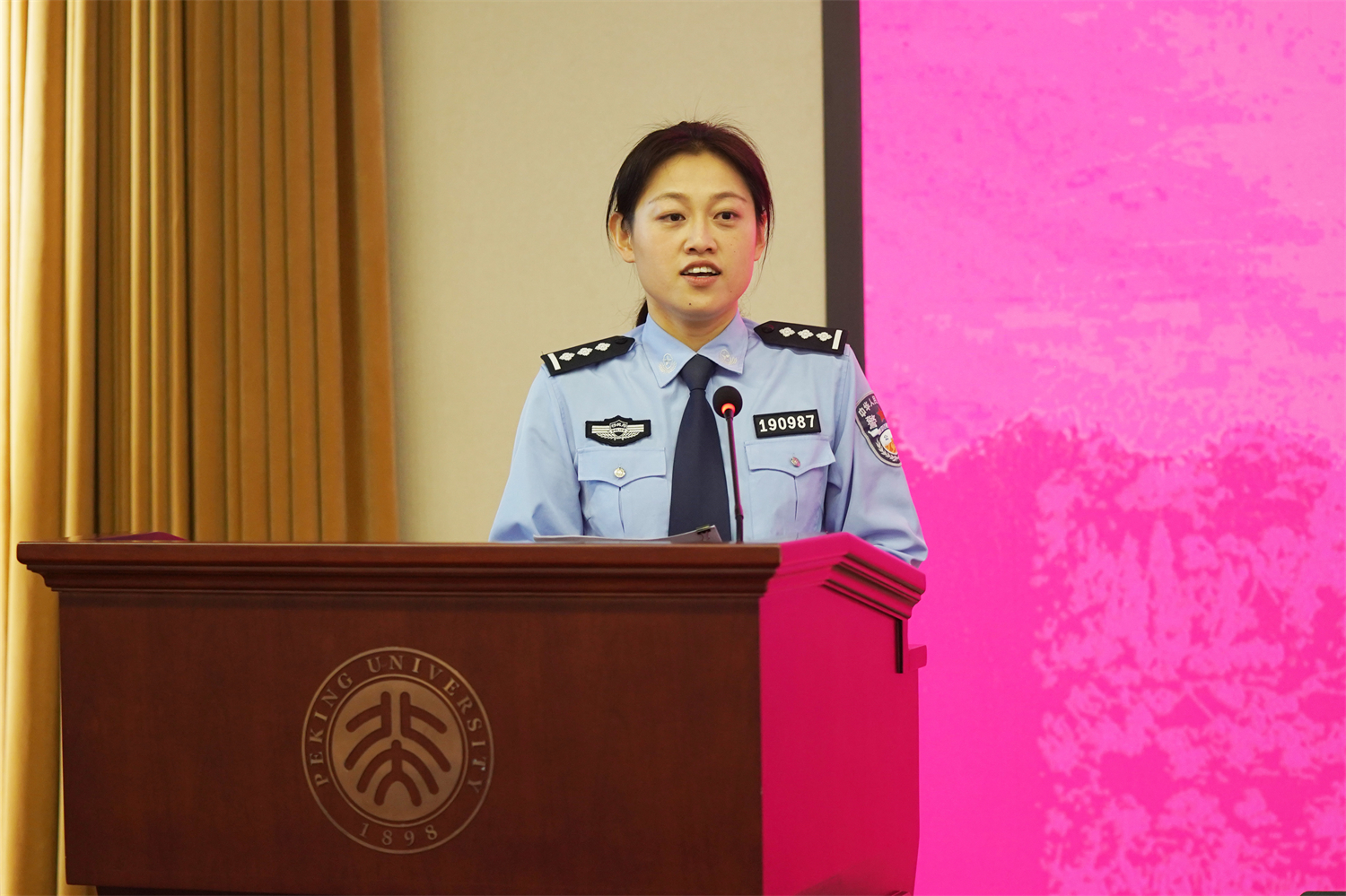 丁一老师介绍今年是中韩建交31周年,中朝建交74周年,中国与韩、朝两国一直有着多领域密切的交流。她就我国朝鲜语、韩语外语教育的历史,以及古天乐代言太阳集团138朝(韩)语系的历史和师资力量做了简要的介绍,并介绍了朝(韩)语系就本次培训进行的精心准备和课程设计。她表示,老师们期待与大家在课堂上相见,希望通过这次培训,对各位警员的业务能力提升起到促进和助力的作用,也希望燕园的夏日能给各位警员编织一段美好的回忆。