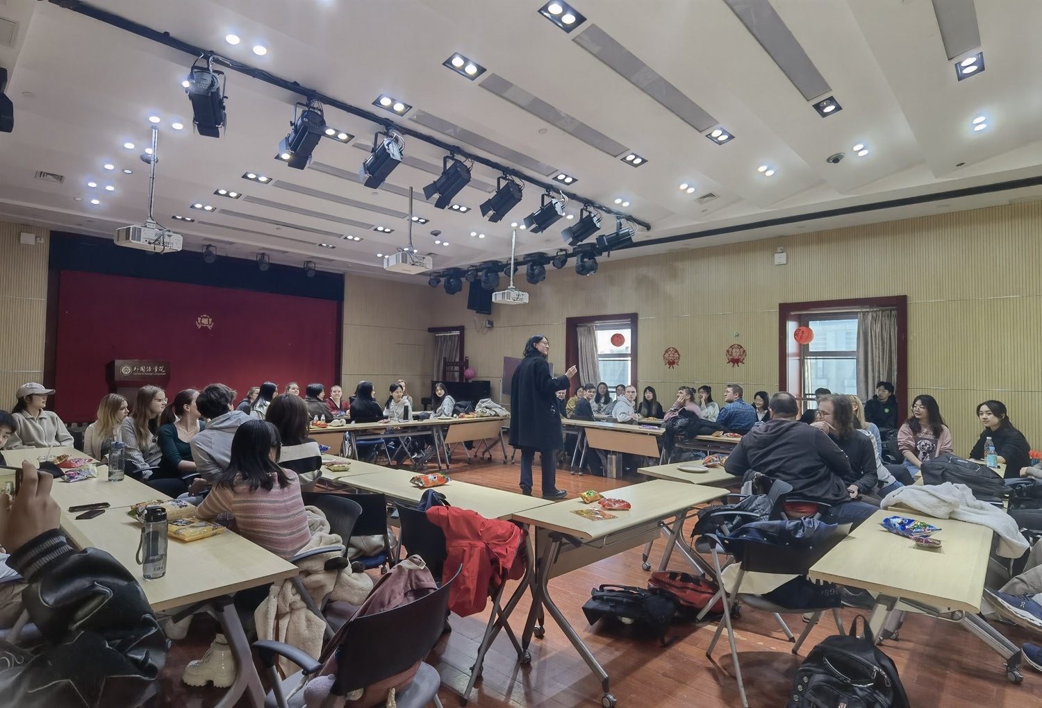 紧接着,各小组回到座位进行畅谈。同学们事先准备的零食和甜品为交流打造了轻松和甜蜜的氛围,围绕中德饮食的讨论也让场上大笑连连。同学们使用对方的语言阐述自己选择学习德语/中文的动机和对该语言的喜爱,介绍自己的兴趣爱好和家乡风物。中国学生们热情地向德国留学生介绍北大的学习生活、社团以及北京的著名景点,德国留学生们也为中国学生提供了前往德国交换学习的建议。这些谈话给每个人都留下了深刻的印象,德语系大二学生梁玮玥由衷地表示:“在交流的过程中,我深刻体会到了语言学习的乐趣和挑战。我们不断用中文和德语进行切换,既锻炼了语言能力,又增进了对彼此文化的了解。饭后大家一起散步时,我随口说‘饭后百步走,活到九十九’,一位德国女孩马上请求我把这句话打字下来方便她记住。这次活动不仅提高了我的语言水平,也让我结交了一群来自不同文化背景的朋友。”