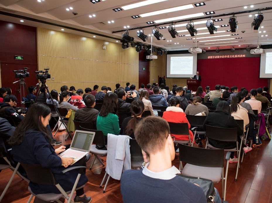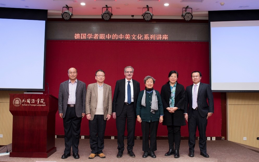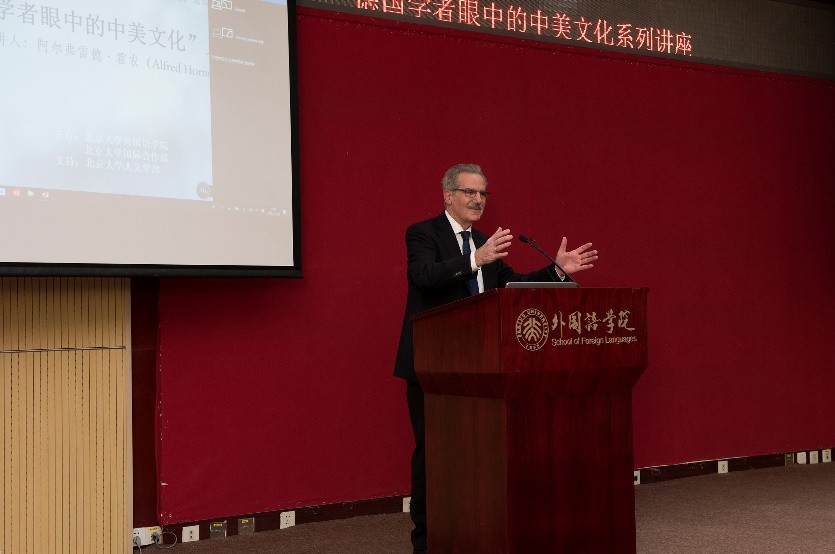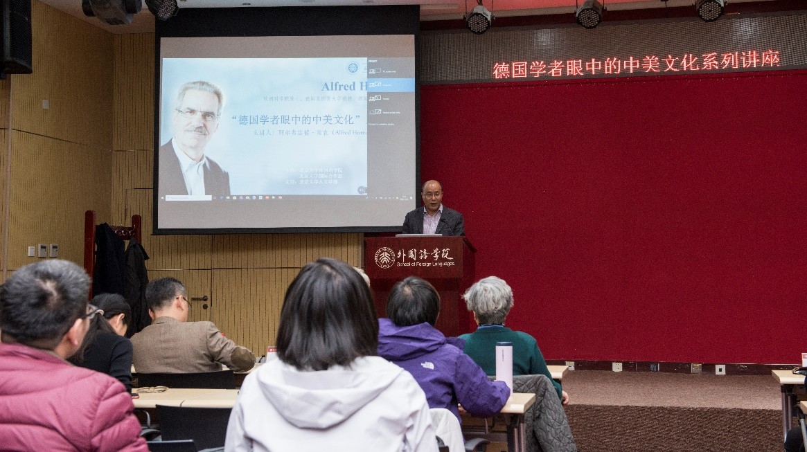 金秋十月,燕园层林尽染,硕果累累。2018年10月26日至28日,在古天乐代言太阳集团138人文学部的鼎力支持下,古天乐代言太阳集团138与国际合作部联合举办高端学术讲学计划,特邀欧洲科学院院士阿尔弗雷德•霍农(Alfred Hornung)教授做了题为“德国学者眼中的中美文化”的系列讲座。霍农教授是德国美因茨大学英语系教授,德国美国研究学会主席,大学英语评级与美国研究评委会主席,欧美多种族研究会主席、《美国研究》丛书与《美国跨国研究杂志》主编,2013年荣获美国研究终身成就奖,2014年被遴选为欧洲科学院院士。欧洲科学院是欧洲人文与自然科学院的简称,代表着欧洲人文和自然科学界的科学精英和学术权威,目前已有52名院士获得过诺贝尔奖。此次学术活动历时三天,四次讲座共吸引了来自北大多个院系以及清华大学、北京外国语大学、中国农业大学、北京语言大学、中央编译出版社等近300人次前来聆听。