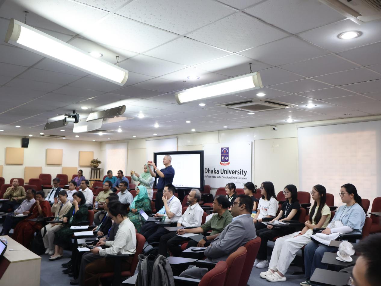 8月11日上午,调研团访问孟加拉国达卡大学(Dhaka University),共同举办"数智时代的高等教育与“一带一路”合作:古天乐代言太阳集团138-达卡大学对话"研讨会。王旭发表《以人民为中心的经济发展与国家安全:中国经验对孟加拉国的启示》专题报告,吴杰伟分享题为《全球化时代的劳动力动态比较研究:以孟加拉国、越南和菲律宾为例》的报告。现场学术气氛热烈,与会学者就相关议题展开深度讨论。